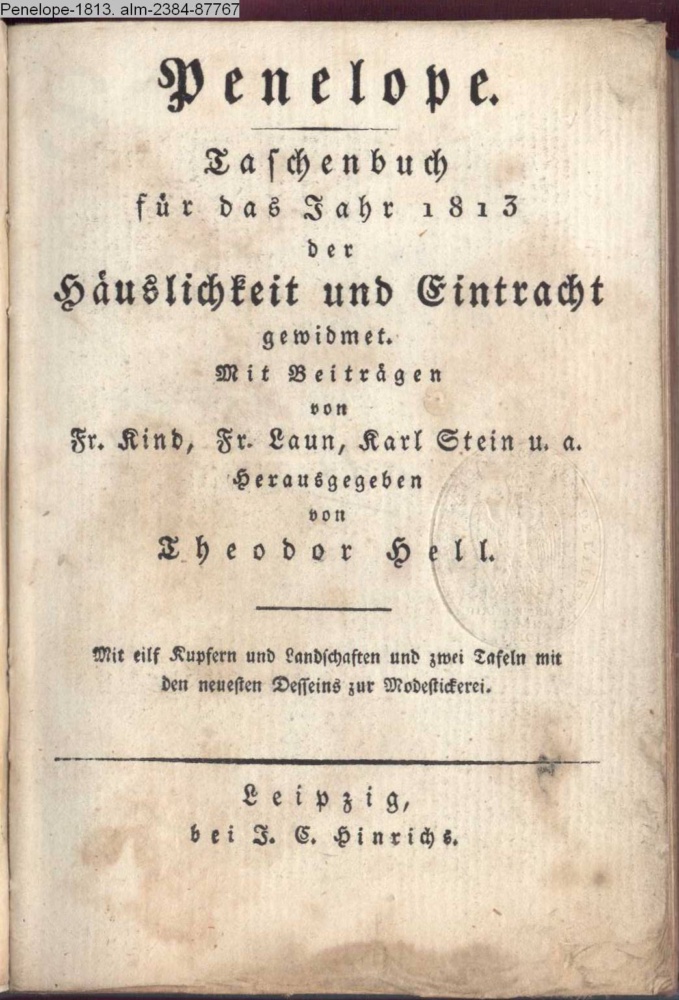 Penelope. / Taschenbuch / für das Jahr 1813 / der / Häuslichkeit und Eintracht / gewidmet. / Mit Beiträgen / von / Fr. Kind, Fr. Laun, Karl Stein u. a. / Herausgegeben / von / Theodor Hell. / Mit eilf Kupfern und Landschaften, und zwei Tafeln mit / den neuesten Desseins zur Modestickerei. / Leipzig, / bei J. C. Hinrichs