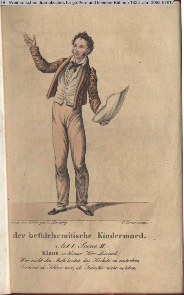 der bethlehemitische Kindermord. / Act I. Scene II. / Klaus (in Weimar Herr Durand.) / Wer nicht den Muth besitzt, das Höchste zu erstreben, / Verdient als Klexer nur, als Künstler nicht zu leben.