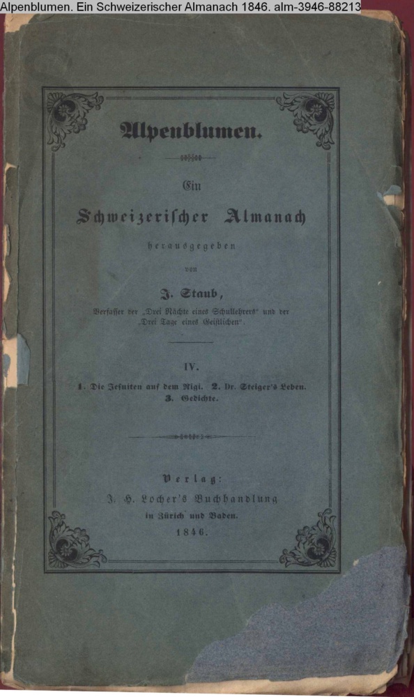 Alpenblumen. / Ein / Schweizerischer Almanach / herausgegeben / von / J. Staub, / Verfasser der Drei Nächte eines Schullehrers und der / Drei Tage eines Geistlichen. / IV. / 1. Die Jesuiten auf dem Rigi. 2. Dr. Steiger's Leben. / 3. Gedichte. / Verlag: J. H. Locher's Buchhandlung / in Zürich und Baden. / 1846