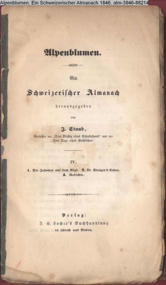 Alpenblumen. / Ein / Schweizerischer Almanach / herausgegeben / von / J. Staub, / Verfasser der Drei Nächte eines Schullehrers und der / Drei Tage eines Geistlichen. / IV. / 1. Die Jesuiten auf dem Rigi. 2. Dr. Steiger's Leben. / 3. Gedichte. / Verlag: J. H. Locher's Buchhandlung / in Zürich und Baden