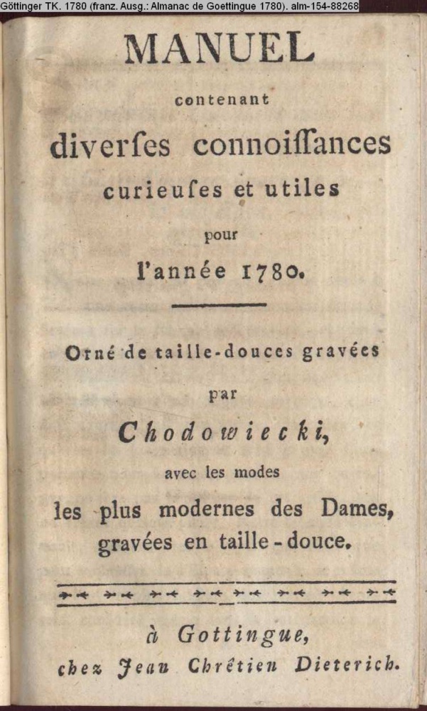 MANUEL / contenant / diverses connoissances / curieuses et utiles / pour / l'année 1780. / par Chodowiecki, / avec les modes / les plus modernes des Dames / gravées en taille-douce. / à Goettingue, / chez Jean Chrêtien Dieterich