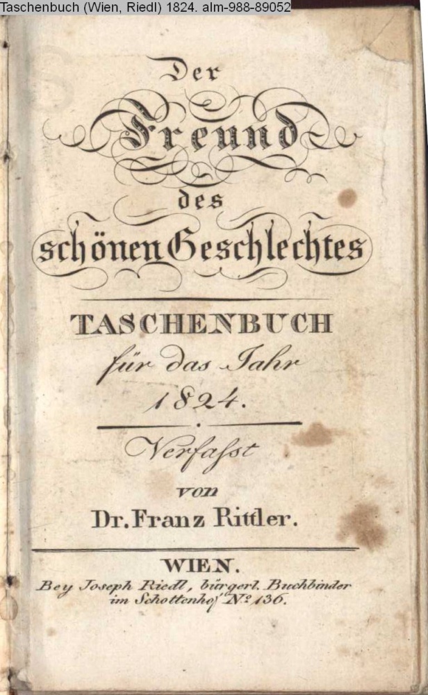Der / Freund / des / schönen Geschlechts / TASCHENBUCH / für das Jahr / 1824. / Verfasst / von / Dr. Franz Rittler. / WIEN. / Bey Jos. Riedl bürgerl. Buchbinder / im Schottenhof No. 136