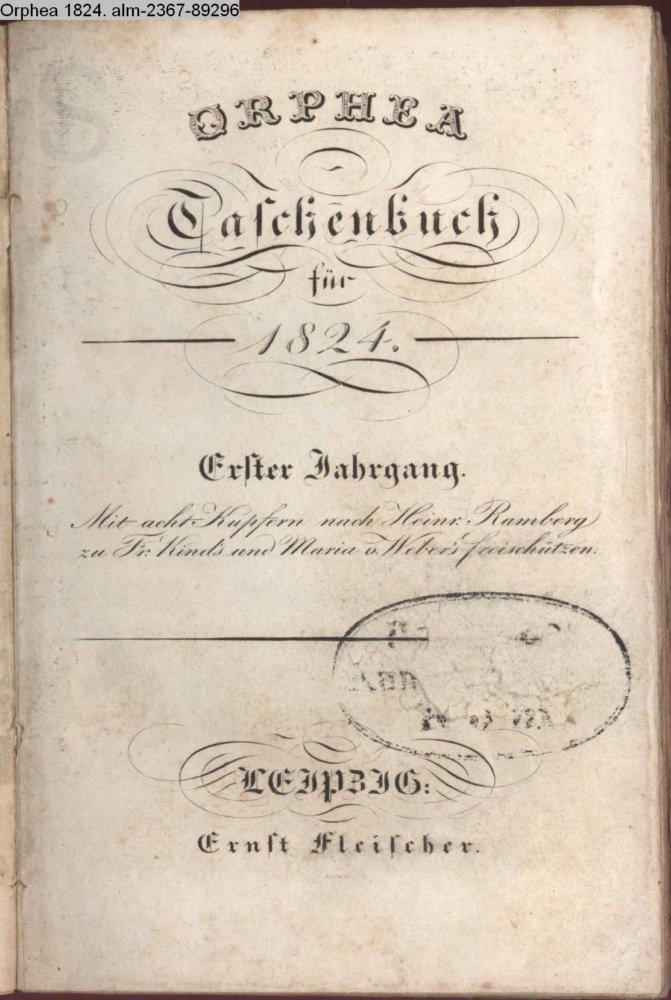 ORPHEA / Taschenbuch / für / 1824. / Erster Jahrgang. / Mit acht Kupfern nach Heinr. Ramberg / zu Fr. Kind's und Maria v. Weber's Freischützen. / LEIPZIG. / Ernst Fleischer