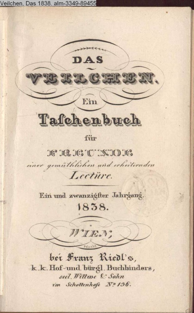 DAS / VEILCHEN. / Ein / Taschenbuch / für / FREUNDE / einer gemüthlichen und erheiternden / Lectüre. / Ein und zwanzigster Jahrgang. / 1838. / WIEN / bei Franz Riedl's / k.k. Hof- und bürgl. Buchbinders / seel. Wittwe & Sohn, / im Schottenhofe No. 136