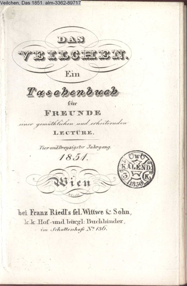 DAS / VEILCHEN. / Ein Taschenbuch / für / FREUNDE / einer gemüthlichen und erheiternden / LECTÜRE. / Vier und Dreysigster Jahrgang. / 1851. / Wien / bei Franz Riedl's sel. Wittwe & Sohn, / k.k. Hof- und bürgl. Buchbinder, / im Schottenhofe No. 136
