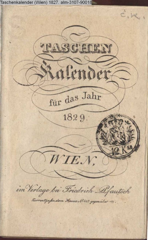 TASCHEN / KALENDER / für das Jahr / 1829. / WIEN, / im Verlage bei Friedrich Pfautsch / Kurrentgasse, dem Hause No. 407 gegenüber