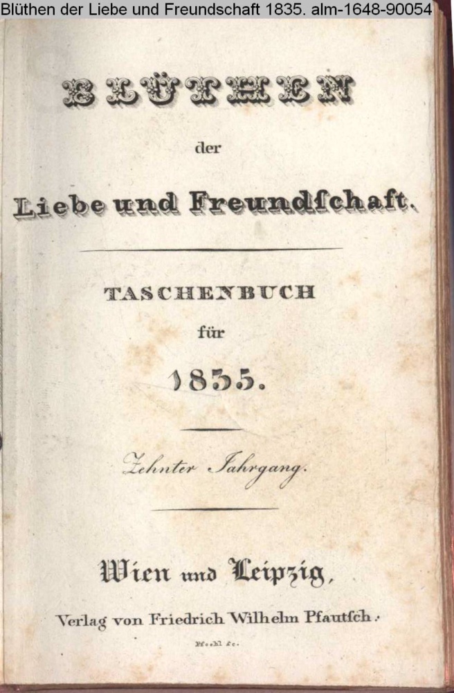 BLÜTHEN / der / Liebe und Freundschaft / TASCHENBUCH / für / 1835. / Zehnter Jahrgang. / Wien und Leipzig, / Verlag von Friedrich Wilhelm Pfautsch