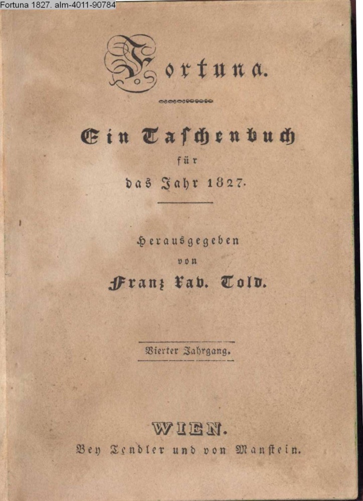 Fortuna. / Ein Taschenbuch / für / das Jahr 1827. / Herausgegeben / von / Franz Xav. Told. / Vierter Jahrgang / WIEN. / Bei Tendler und von Manstein