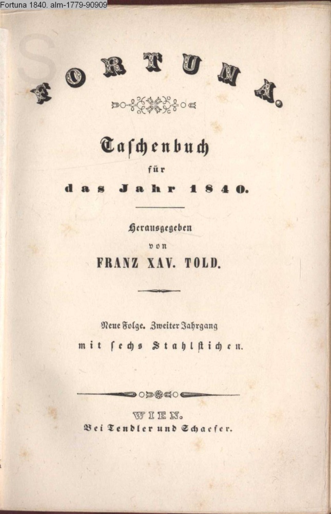 FORTUNA / Taschenbuch / für / das Jahr 1840. / Herausgegeben / von / FRANZ XAV. TOLD. / Neue Folge. Zweiter Jahrgang / mit sechs Stahlstichen. / WIEN. / Bei Taendler und Schafer