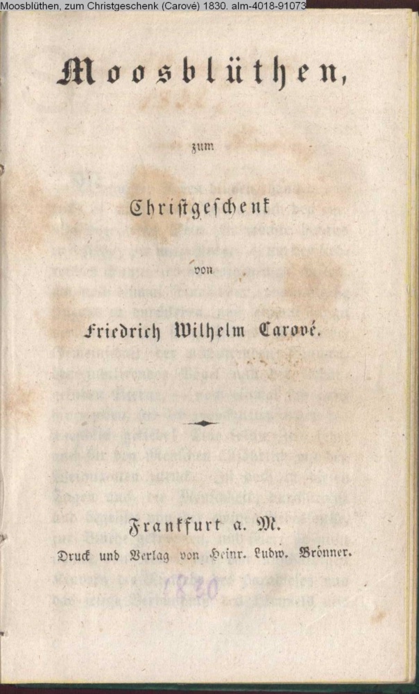 Moosblüthen, / zum Christgeschenk / von / Friedrich Wilhelm Carové. / Frankfurt a. M. / Druck und Verlag von Heinr. Ludw. Brönner