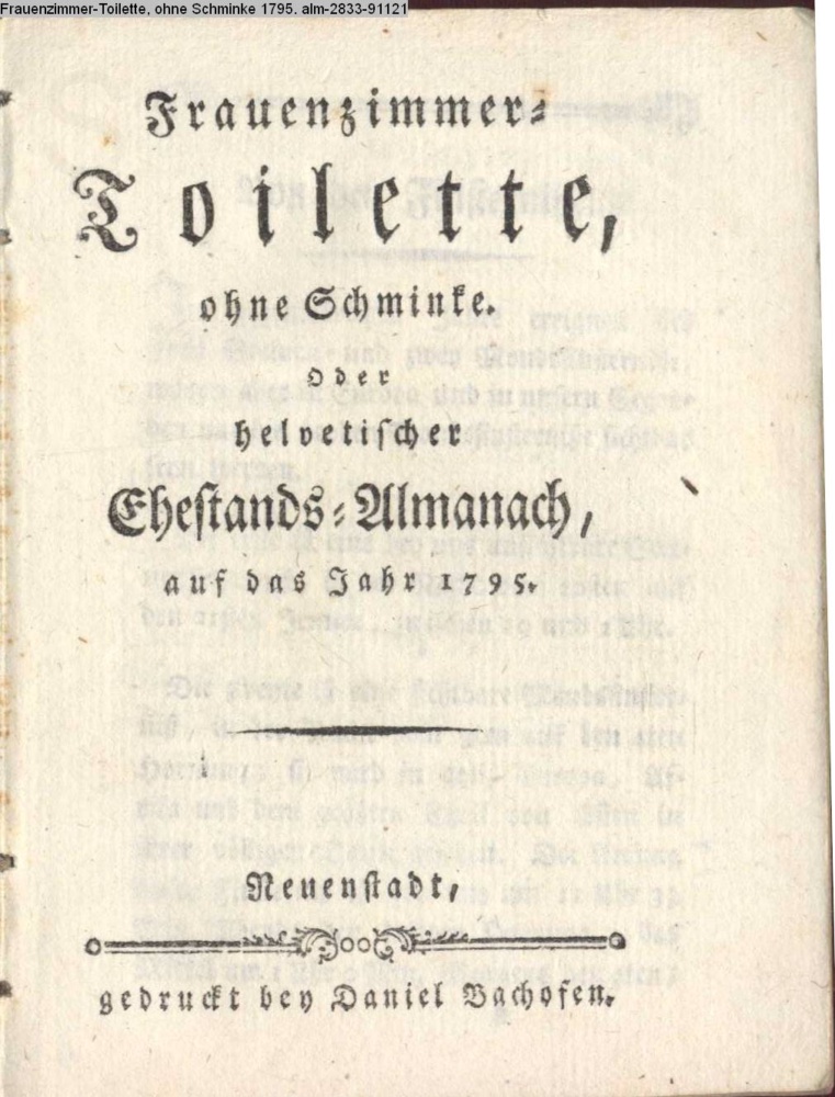 Frauenzimmer- / Toilette, / ohne Schminke. / Oder / helvetischer / Ehestands-Almanach, / auf das Jahr 1795. / Neuenstadt, / gedruckt bey Daniel Bachofen