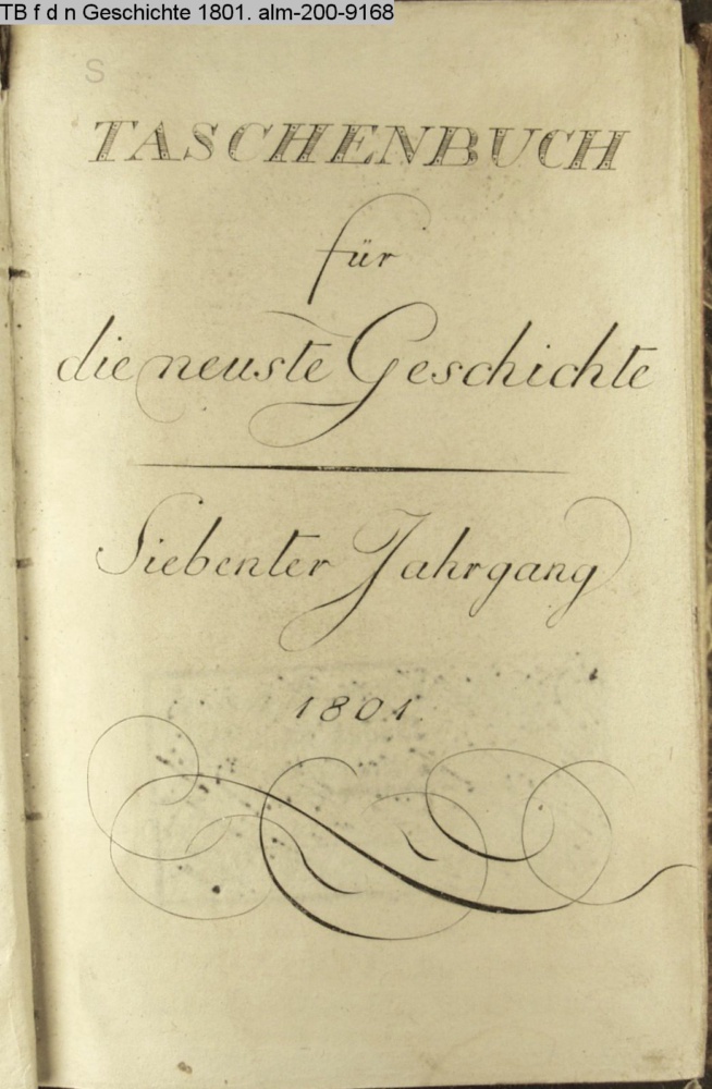 Taschenbuch / für / die neuste Geschichte. / Herausgegeben / von / D. Ernst Ludwig Posselt. / Siebenter Jahrgang. / Mit Küffnerischen Kupfern. / Nürnberg, / in der Bauer- und Mannischen Buchhandlung. / 1801