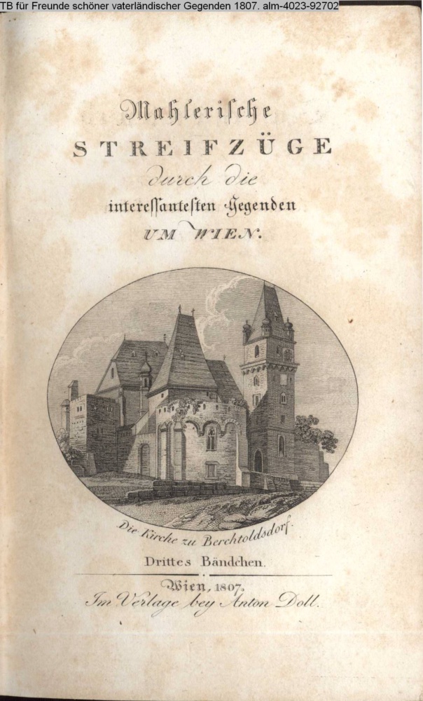 Mahlerische / STREIFZÜGE / durch die / interessantesten Gegenden / UM WIEN. / Drittes Bändchen. WIEN, 1807. / Im Verlage bey Anton Doll