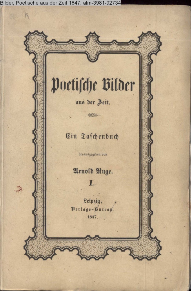Poetische Bilder / aus der Zeit. / Ein Taschenbuch / herausgegeben von / Arnold Ruge. I. / Leipzig. / Verlagsbureau. / 1847