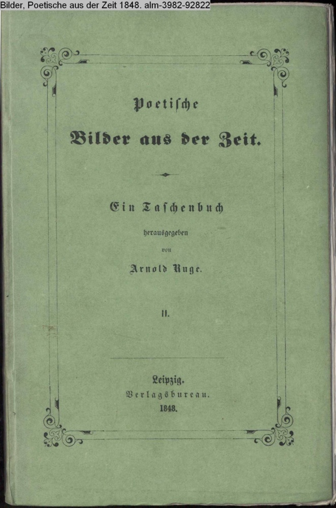 Poetische Bilder / aus der Zeit. / Ein Taschenbuch / herausgegeben / von / Arnold Ruge. / II. / Leipzig. / Verlagsbureau. / 1848
