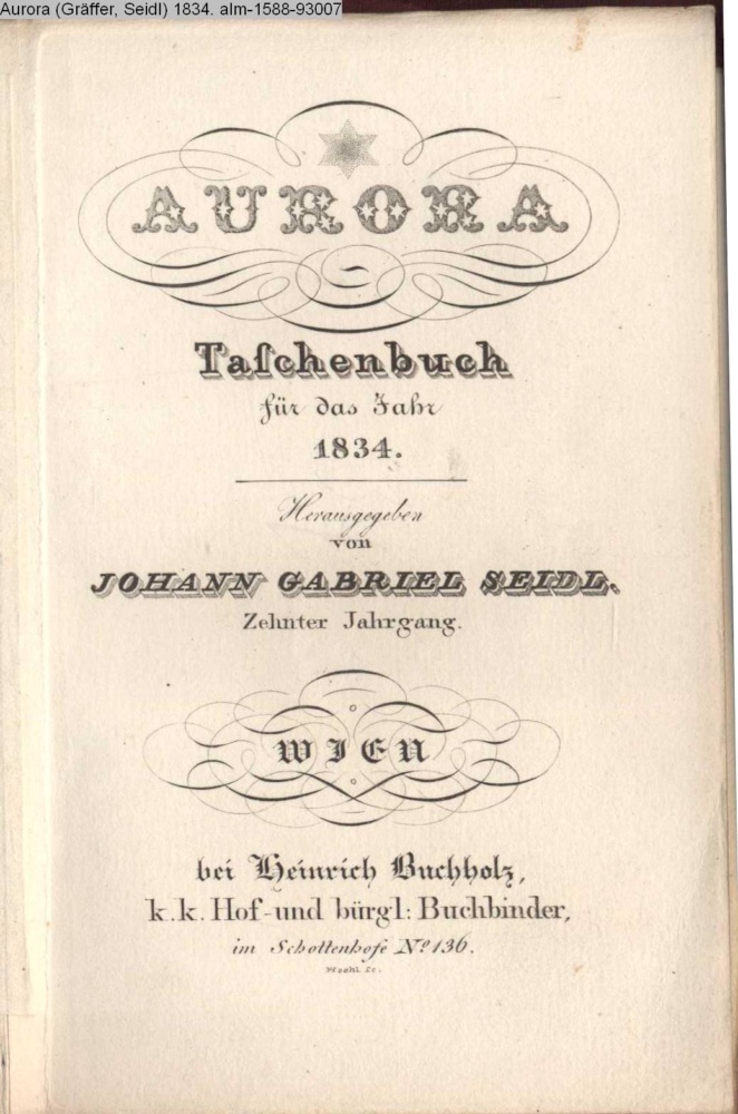 AURORA / Taschenbuch / für / das Jahr / 1834. / Herausgegeben / von / JOHANN GABRIEL SEIDL. / Zehnter Jahrgang. / WIEN / bei Heinrich Buchholz, / k.k. Hof- und bürgl. Buchbinder, / im Schottenhofe No. 136
