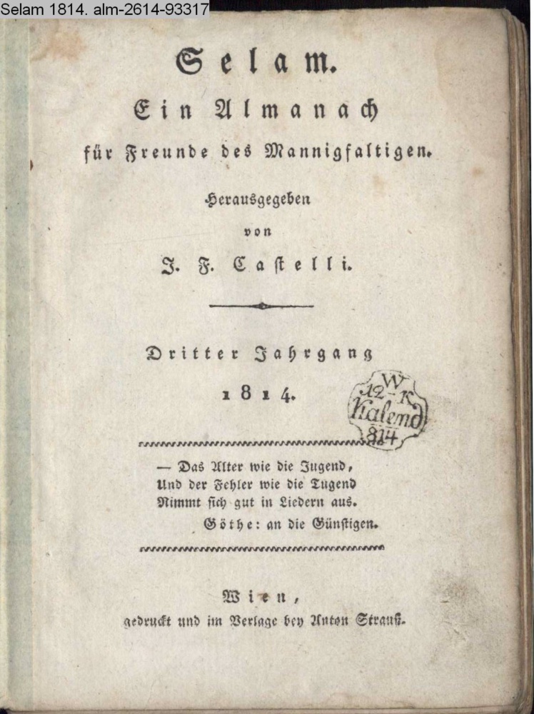 Selam. / Ein Almanach / für Freunde des Mannigfaltigen. / Herausgegeben / von / I. F.Castelli. / Dritter Jahrgang / 1814. / Das Alter wie die Jugend, / Und der Fehler wie die Tugend / Nimmt sich gut in Liedern aus. / Göthe: an die Günstigen. / Wien, / gedruckt und im Verlage bey Anton Strauß