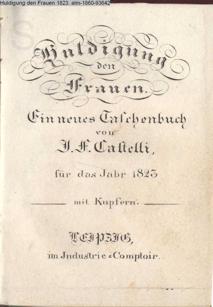Huldigung / den / Frauen. / Ein neues Taschenbuch / von / I. F. Castelli / für das Jahr 1823 / mit Kupfern. / LEIPZIG, / im Industrie-Comptoir