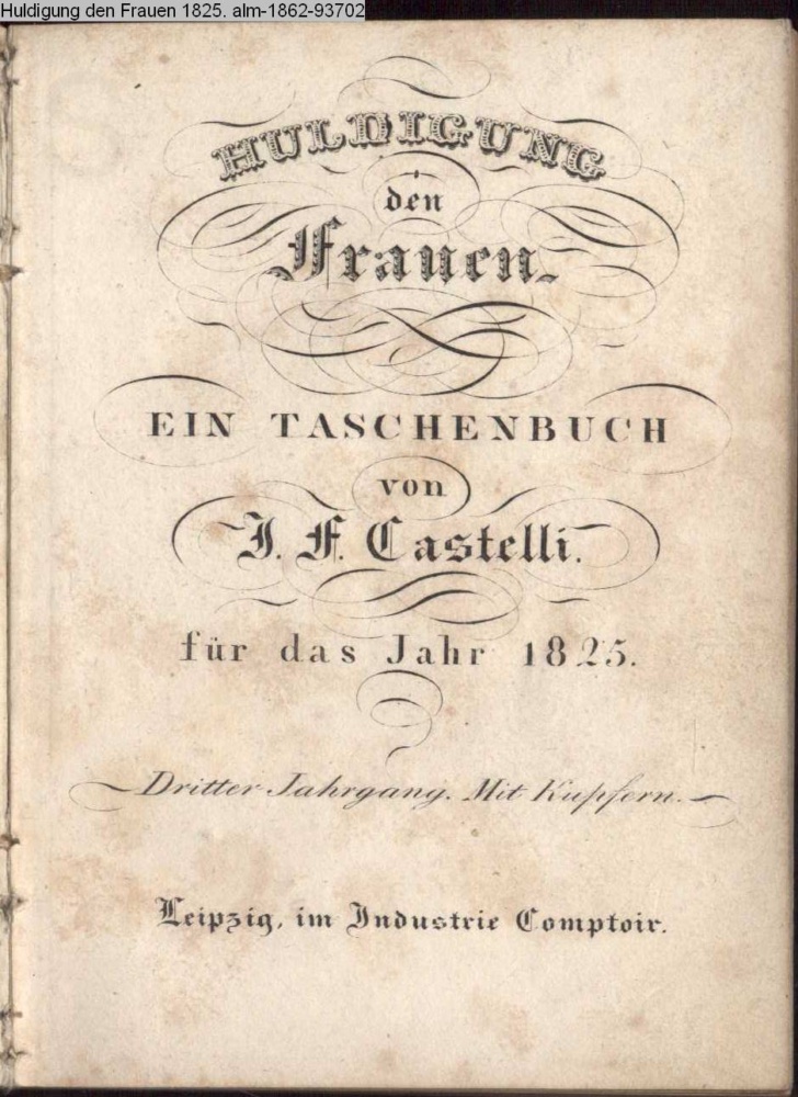 HULDIGUNG / den / Frauen. / EIN TASCHENBUCH / von / I. F. Castelli. / für das Jahr 1825. / Dritter Jahrgang. Mit Kupfern. / Leipzig, im Industrie Comptoir