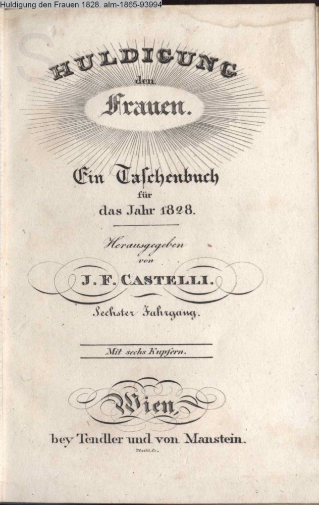 HULDIGUNG / den / Frauen. / Ein Taschenbuch / für das Jahr 1828. / Herausgegeben / von / I. F. CASTELLI. / Sechster Jahrgang. / Mit sechs Kupfern. / Wien, / bey Tendler und von Manstein