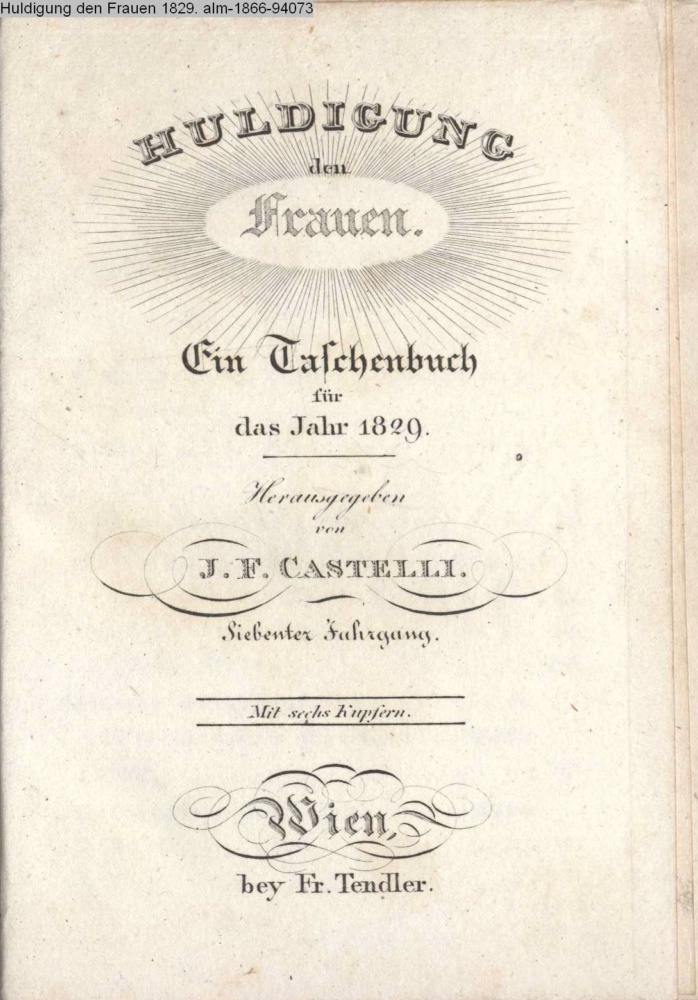 HULDIGUNG / den / Frauen. / Ein Taschenbuch / für / das Jahr 1829. / Herausgegeben / von / I. F. CASTELLI. / Siebenter Jahrgang. / Mit sechs Kupfern. / WIEN, / bey Fr. Tendler