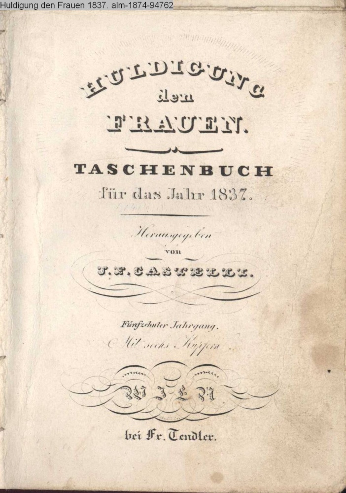 HULDIGUNG / den / FRAUEN. / TASCHENBUCH / für das Jahr 1837. / Herausgegeben / von / I. F. CASTELLI. / Fünfzehnter Jahrgang. / Mit sechs Kupfern. / WIEN, / bei Fr. Tendler