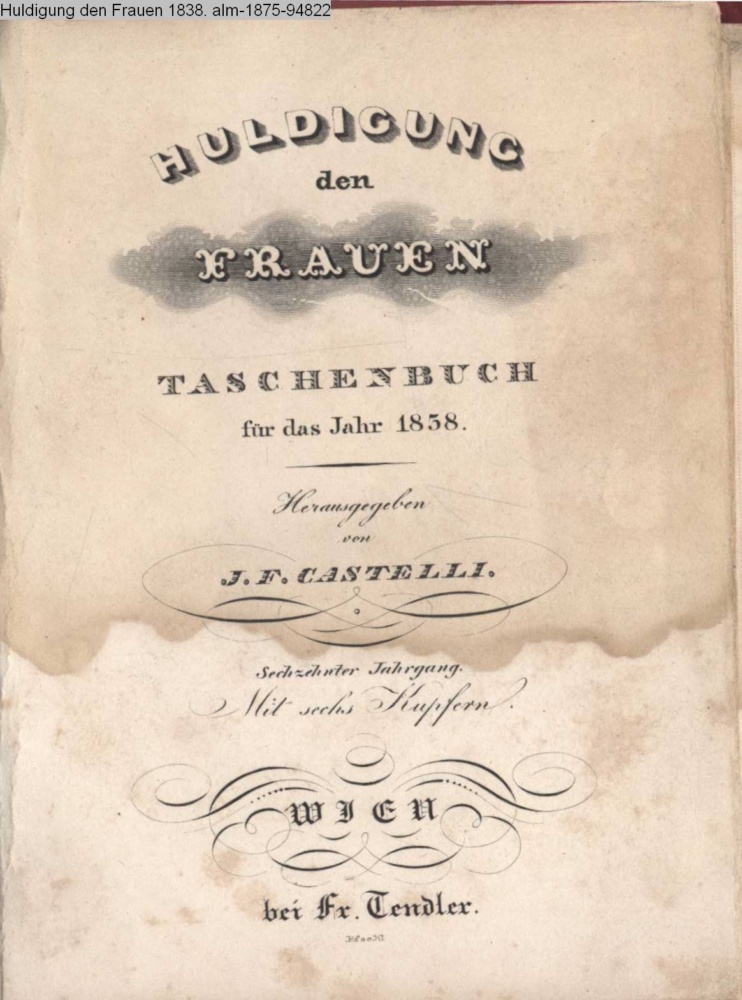 HULDIGUNG / den / FRAUEN / TASCHENBUCH / für das Jahr 1838. / Herausgegeben / von / I. F. CASTELLI. / Sechzehnter Jahrgang. / Mit sechs Kupfern. / WIEN / bei Fr. Tendler