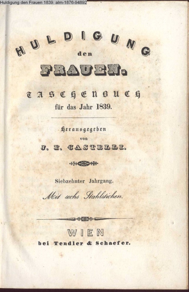 HULDIGUNG / den / FRAUEN. / TASCHENBUCH / für das Jahr 1839. / Herausgegeben / von / I. F. CASTELLI. / Siebzehnter Jahrgang. / Mit sechs Stahlstichen. / WIEN / bei Tendler & Schaefer