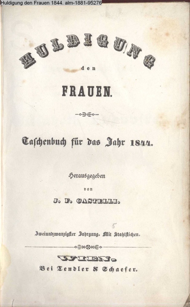HULDIGUNG / den / FRAUEN. / Taschenbuch für das Jahr 1844. / Herausgegeben / von / I. F. CASTELLI. / Zweiundzwanzigster Jahrgang. Mit Stahlstichen. / WIEN. / Bei Tendler & Schaefer