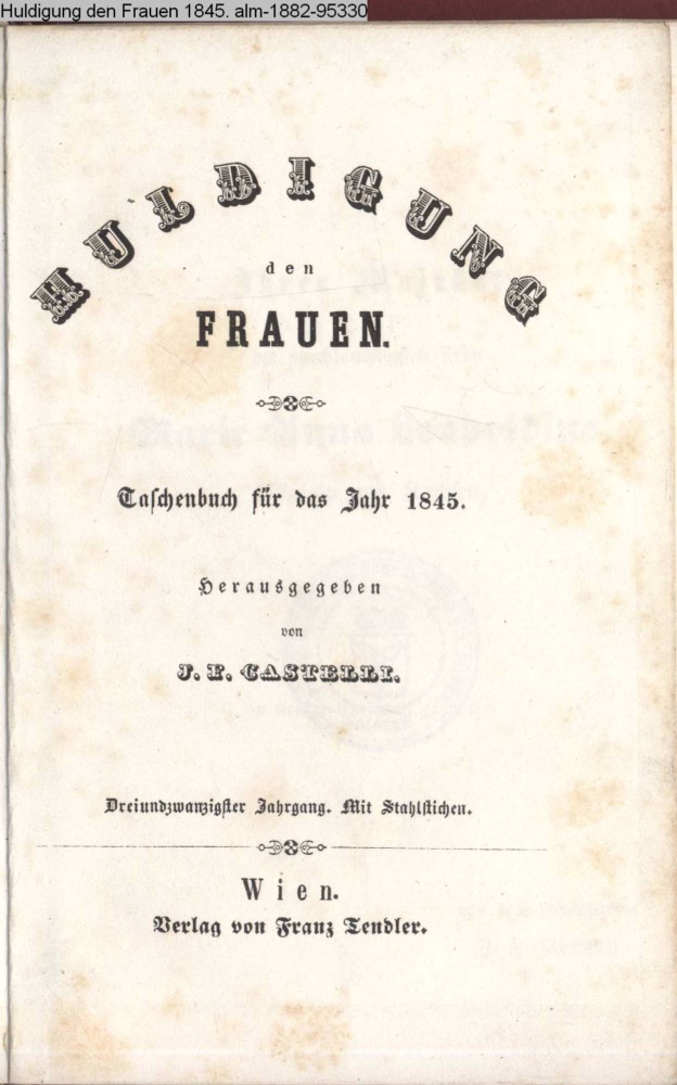HULDIGUNG / den / FRAUEN. / Taschenbuch für das Jahr 1845. / Herausgegeben / von / I. F. CASTELLI. / Dreiundzwanzigster Jahrgang. Mit Stahlstichen. / WIEN. / Verlag von Franz Tendler