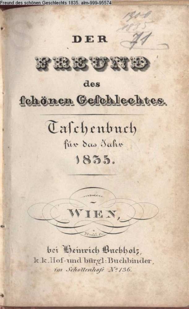 Der FREUND / des / schönen Geschlechtes. / Taschenbuch / für das Jahr / 1835. / WIEN, / bei Heinrich Buchholz. / k.k. Hof- und bürgl. Buchbinder, / im Schottenhofe No. 136