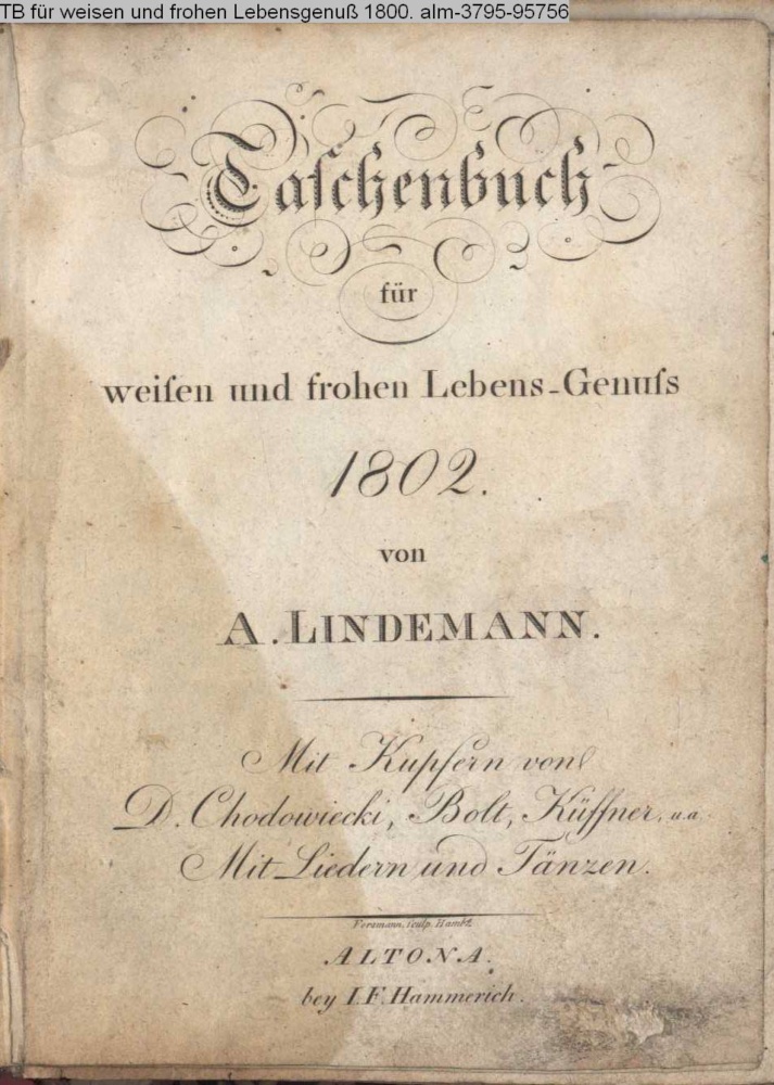 Taschenbuch / für / weisen und frohen Lebens-Genuss / 1800. / von / A. LINDEMANN. / Mit Kupfern von / D. Chodowiecki, Bolt, Küffner, u. a. / Mit Liedern und Tänzen. ALTONA. / bey I. F. Hammerich