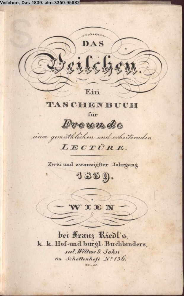 DAS / VEILCHEN. / Ein / TASCHENBUCH / für / Freunde / einer gemüthlichen und erheiternden / LECTÜRE. / Zwei und zwanzigster Jahrgang. / 1839. / WIEN / bei Franz Riedl's / k.k. Hof- und bürgl. Buchbinders, / seel. Wittwe & Sohn, / im Schottenhofe No. 136