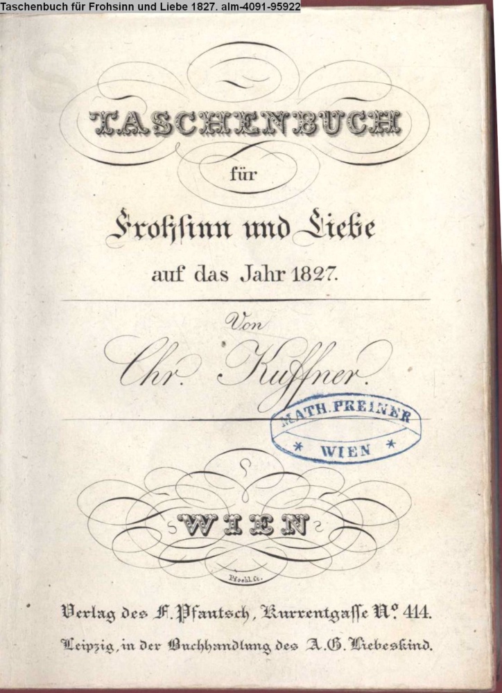 TASCHENBUCH / für / Frohsinn und Liebe / auf das Jahr 1827. / Von / Chr. Kuffner. / WIEN / Verlag des F. Pfautsch, Kurrentgasse No. 414. / Leipzig, in der Buchhandlung des A. G. Liebeskind