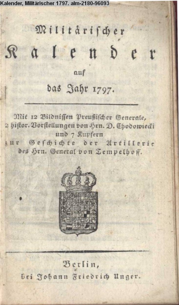 Militärischer / Kalender / auf / das Jahr 1797. / Mit 12 Bildnissen Preußischer Generale, / 2 histor. Vorstellungen von Hrn. D. Chodowiecki / und 7 Kupfern / zur Geschichte der Artillerie / des Hrn. General von Tempelhoff. / Berlin, / bei Johann Friedrich Unger