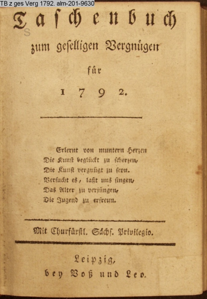 Taschenbuch / zum geselligen Vergnügen / für / 1792. / Erlernt von muntern Herzen / Die Kunst beglückt zu scherzen, / Die Kunst vergnügt zu seyn. / Versucht es, laßt uns singen, / Das Alter zu verjüngen, / Die Jugend zu erfreun. / Mit Churfürstl. Sächs. Privelegio. / Leipzig, / bey Voß und Leo