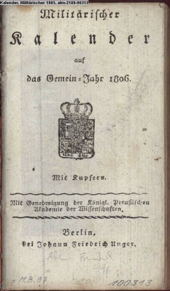 Militärischer / Kalender / auf / das Gemein-Jahr 1806. / Mit Kupfern. / Mit Genehmigung der Königl. Preußischen / Akademie der Wissenschaften. / Berlin, / bei Johann Friedrich Unger