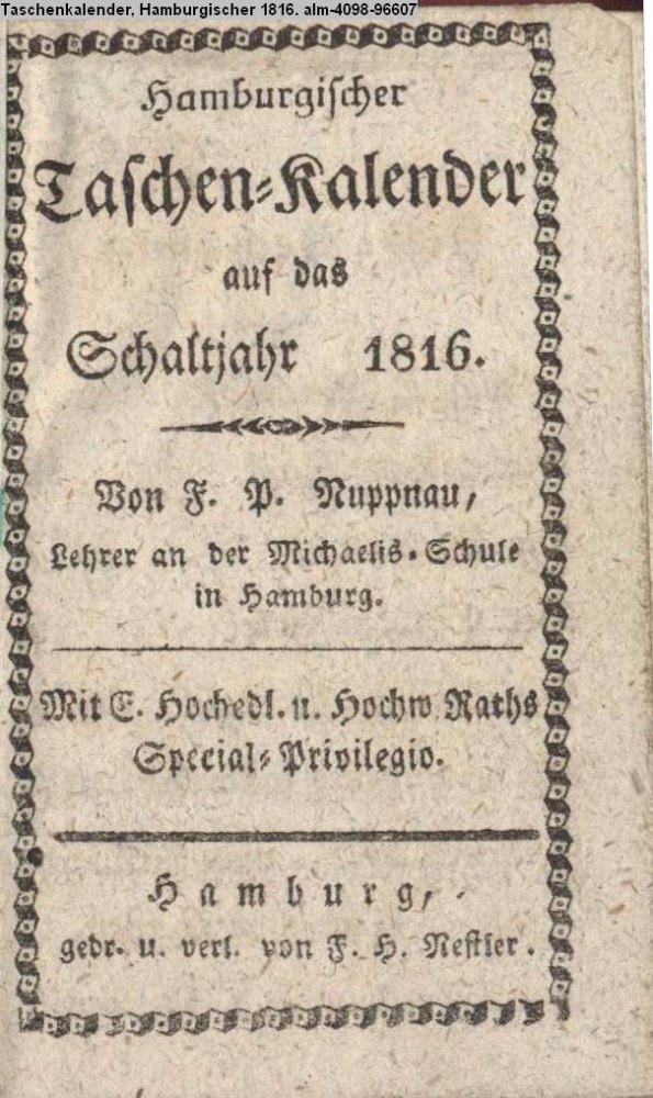 Hamburgischer / Taschen-Kalender / auf das / Schalt-Jahr 1816. / Von / F. P. Nuppnau, / Lehrer an der Michaelis-Schule / in Hamburg. / Mit E. Hochedl. u. Hochw. Raths / Special-Privilegio. / Hamburg, / gedr. u. verl. von F. H. Nestler