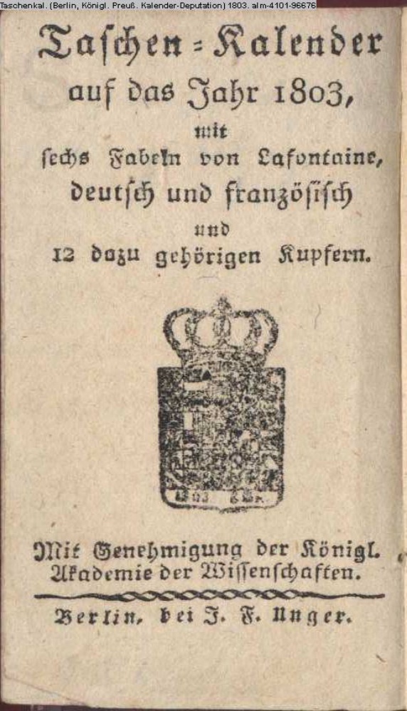Petit / ALMANACH / pour l'an 1803, / avec / six fables de Mr. Lafontaine, / françoises et allemandes, / et / 12 estampes qui s'y rapportent. / Avec l'approbation de l' Académie / royale des sciences. / Berlin, / chez J. F. Unger