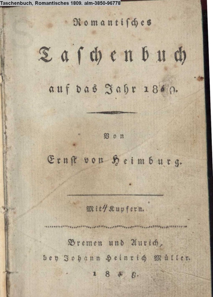 Romantisches / Taschenbuch / auf das Jahr 1809. / Von / Ernst von Heimburg. / Mit 4 Kupfern / Bremen und Aurich, / bey Johann Heinrich Müller. / 1809