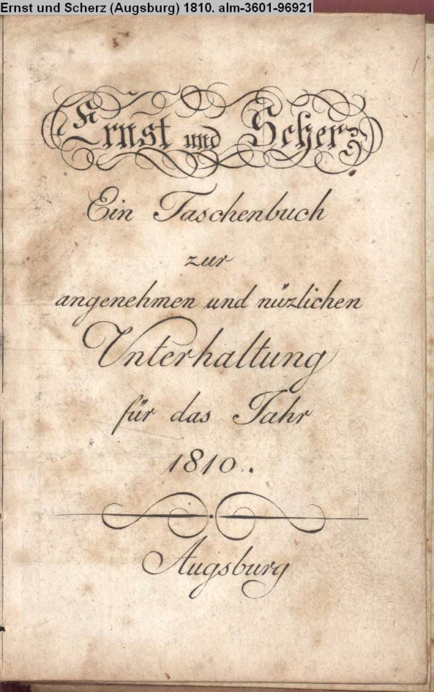 Ernst und Scherz. / Ein Taschenbuch / zur / angenehmen und nüzlichen / Unterhaltung / für das Jahr / 1810. / Augsburg