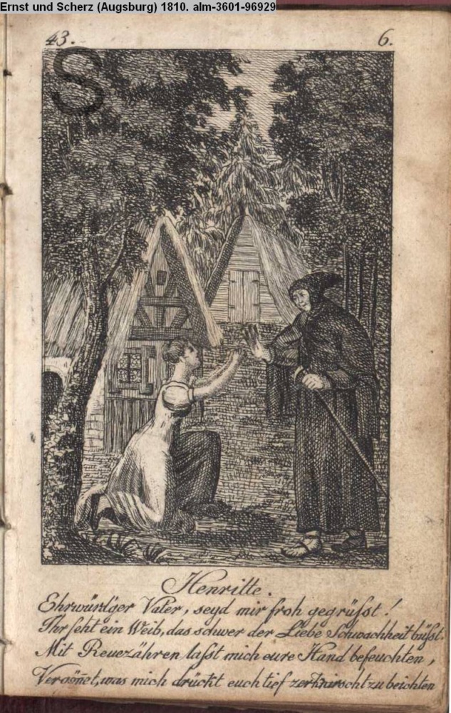 Henritte. / Ehrwürdiger Vater, seyd mir froh gegrüsst! / Ihr seht ein Weib, das schwer der Liebe Schwachheit büsst, / mit Reuezähren lasst mich eure Hand befeuchten, / Vergönnt, was mich drückt euch tief zerknirscht zu beichten.