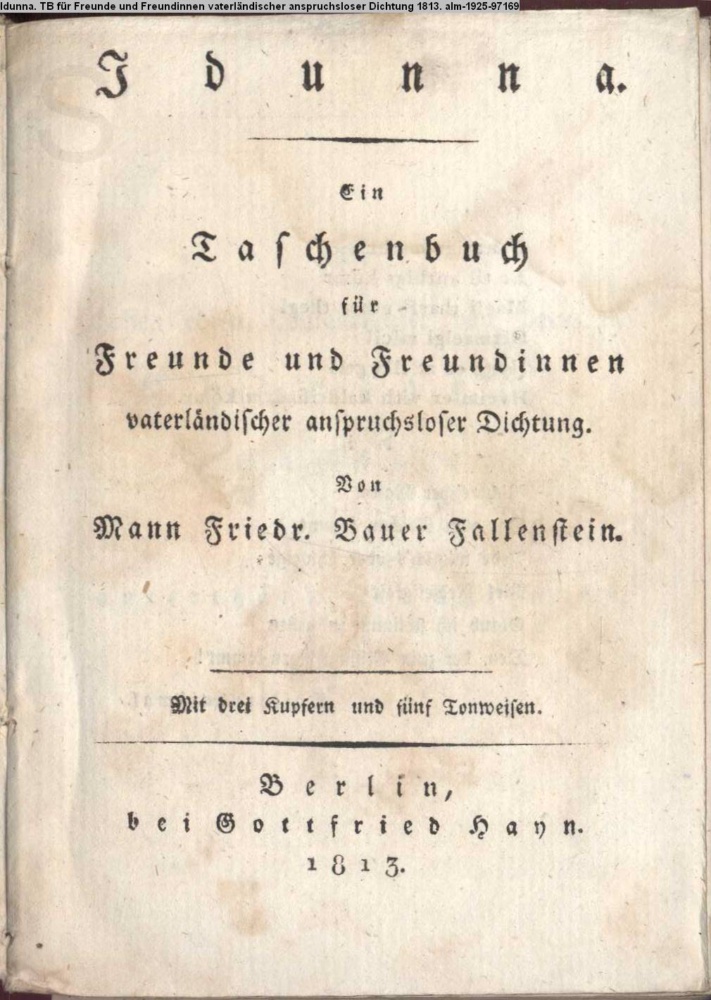 Idunna. / Ein / Taschenbuch / für / Freunde und Freundinnen / vaterländischer anspruchsloser Dichtung. / Von / Mann Friedr. Bauer Fallenstein. / Mit drei Kupfern und fünf Tonweisen. / Berlin, / bei Gottfried Hayn. / 1813
