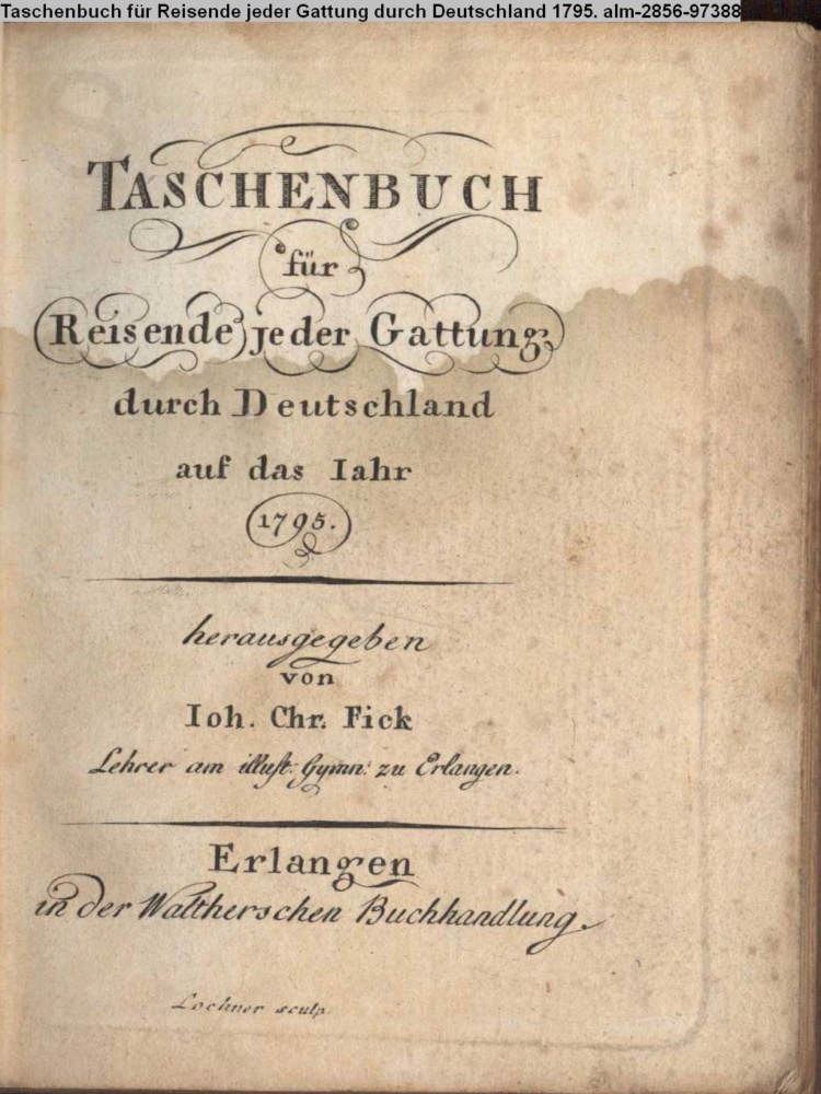TASCHENBUCH / für / Reisende jeder Gattung / durch Deutschland / auf das Jahr / 1795. / herausgegeben / von / Joh. Chr. Fick / Lehrer am illust. Gymn. zu Erlangen. / Erlangen / in der Waltherschen Buchhandlung