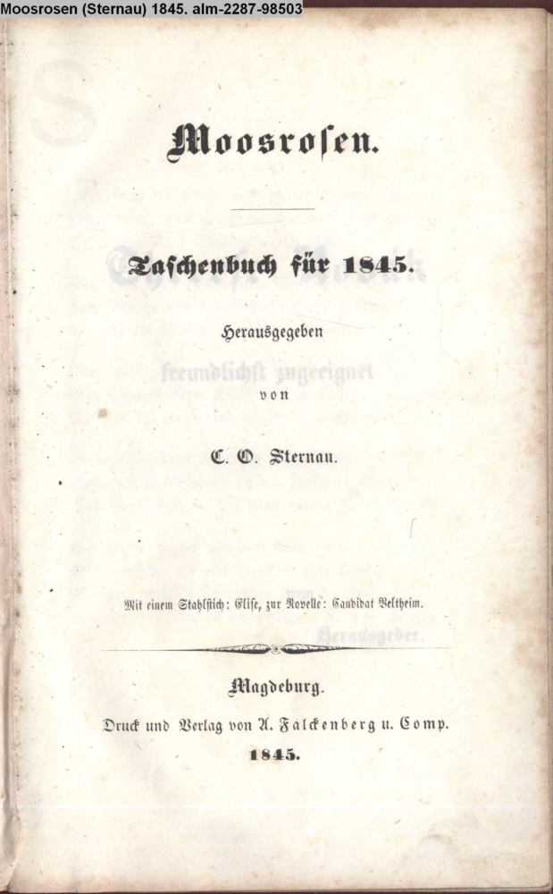 Moosrosen. / Taschenbuch für 1845. / Herausgegeben / von / C. O. Sternau. / Mit einem Stahlstich: Elise, zur Novelle: Candidat Veltheim. / Magdeburg. / Druck und Verlag von A. Falckenberg u. Comp. / 1845