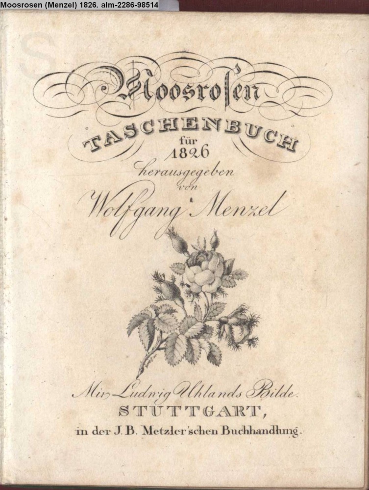 Moosrosen / TASCHENBUCH / für / 1826 / herausgegeben / von / Wolfgang Menzel / Mit Ludwig Uhlands Bilde. / STUTTGART, / in der J. B. Metzler'schen Buchhandlung