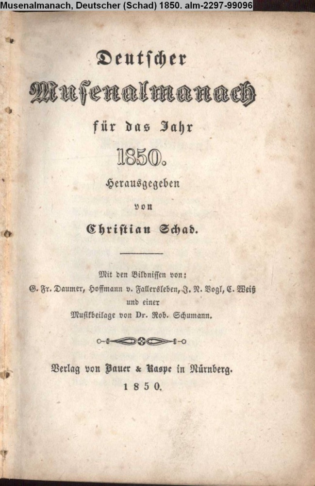 Deutscher / Musenalmanach / für das Jahr / 1850. / Herausgegeben / von / Christian Schad. / Mit den Bildnissen von / G. F. Daumer, Hoffmann v. Fallersleben, J. N. Vogl, C. Weiß / und einer / Musikbeilage von Dr. Rob. Schumann. / Verlag von Bauer & Raspe in Nürnberg. / 1850