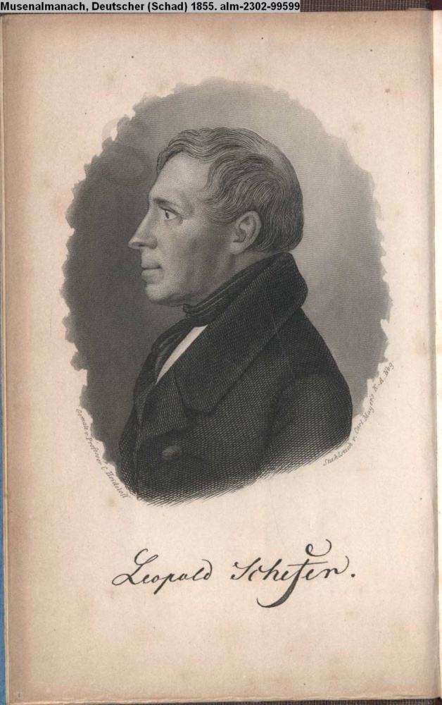 Deutscher / Musenalmanach. / Herausgegeben / von / Christian Schad. / Mit dem Bildniß Leopold Schefers und einer Musikbeilage / von Andreas Zöllner. / Fünfter Jahrgang. / Würzburg. / Stahel'sche Buchhandlung. / 1855