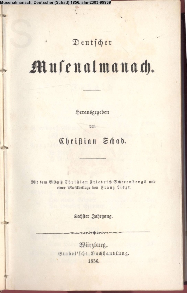 Deutscher / Musenalmanach. / Herausgegeben / von / Christian Schad. / Mit dem Bildniß Christian Friedrich Scherenbergs und / einer Musikbeilage von Franz Liszt. / Sechster Jahrgang. / Würzburg. / Stahel'sche Buchhandlung. / 1856