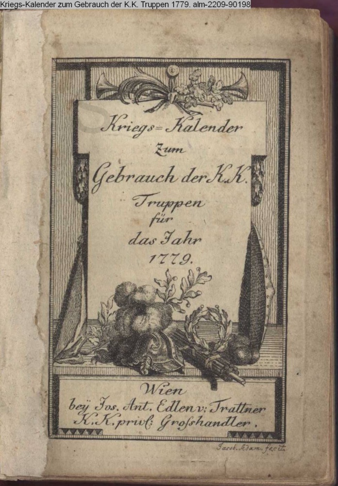 Kriegs-Kalender / zum / Gebrauch der K.K. / Truppen / für / das Jahr / 1779. / Wien / bey Jos. Anton Edlen v. Trattner / K.K. privl. Grosshandler